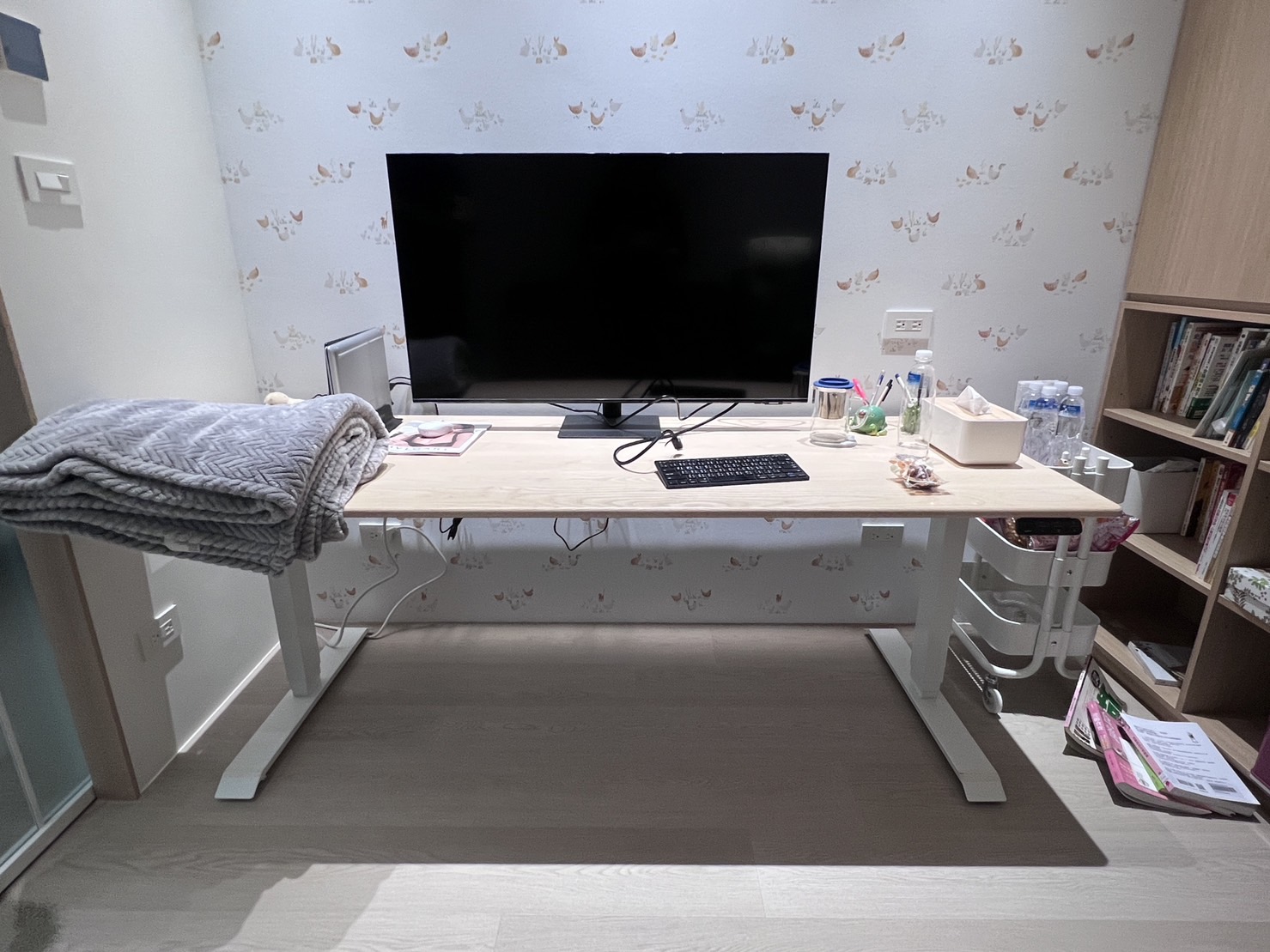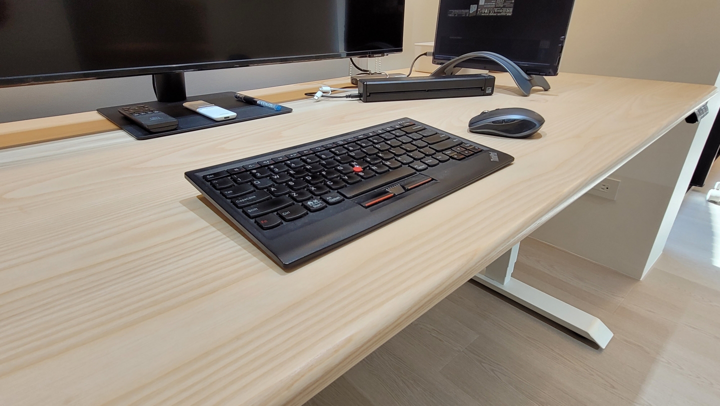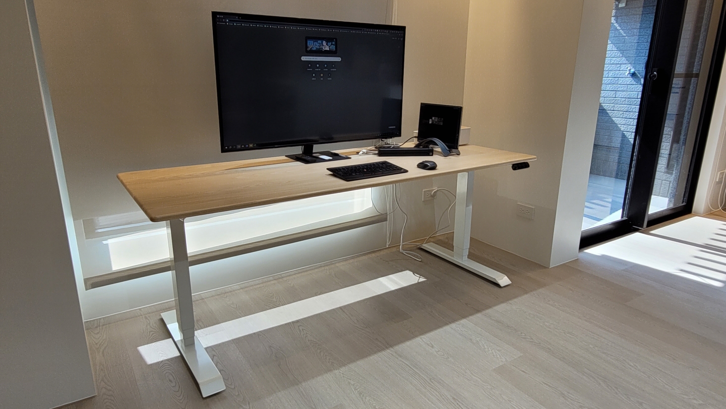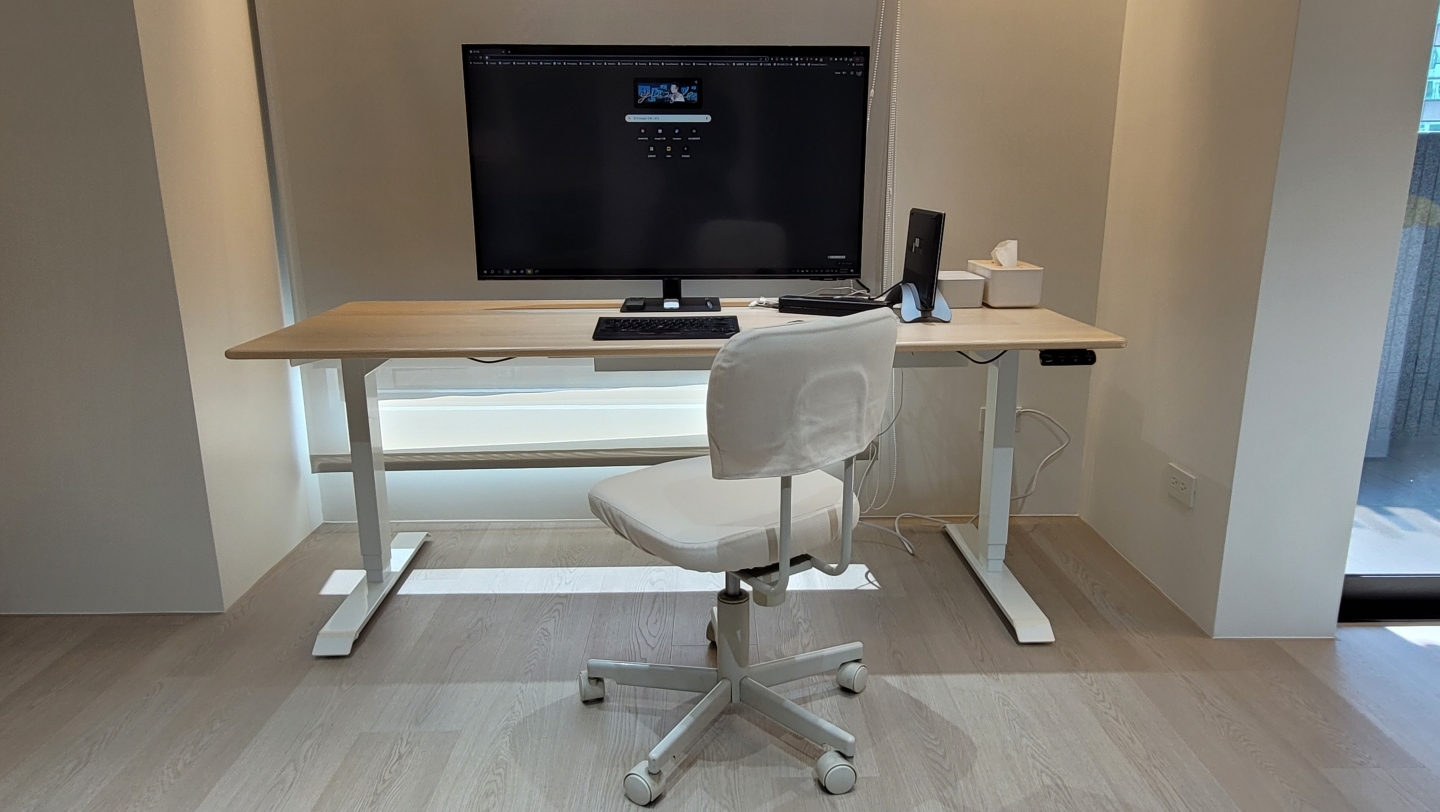 丈夫的升降桌被放置在客廳的一旁,而妻子的則安置在主臥的空間裡。每當下班或週末需要在家工作時,兩人便會分別在各自的工作區域中忙碌,互不干擾。